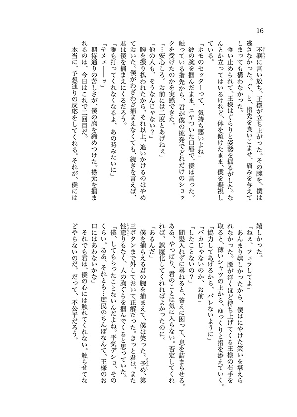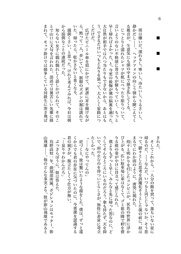 どしゃぶりの雨の放課後、月島は、コンビニで雨宿りをする影山を見つけた。 「王様ってさ、好きなんでショ、アイツのこと」──その日、二人の秘密で危うい関係が始まった。