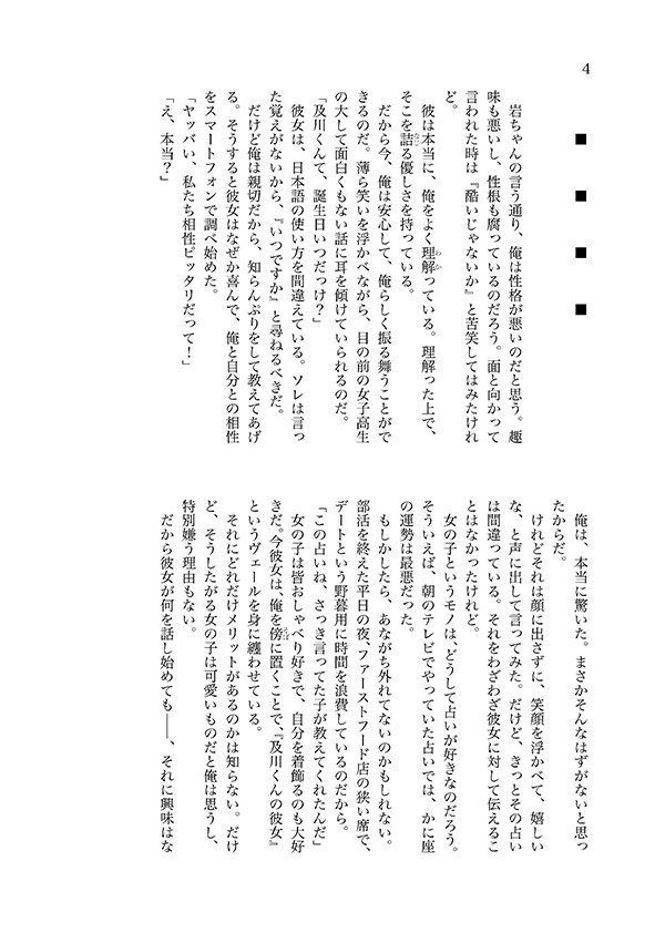 IH予選直後、彼女と別れたばかりの及川と辞書を買いに来た影山は偶然に再会する。たまに顔を合わせてもケンカばかりしてしまう。こうしている時だけはお前が可愛く思えたりもする。素直じゃない及影の不器用でいびつな恋のお話。